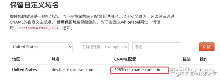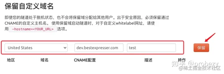 地区下拉菜单选择United States,输入您的域名dev.bestexpresser.com作为保留域名,点击保留按钮。 这保证了没有其他人可以使用自己的隧道劫持您的域名。