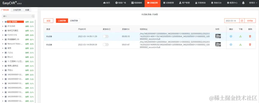 从上图中我们会发现,通过列表模式展现的录像文件是片段的,并不是完整的,这个是由于软件在录像的过程中,需要自定义时间来进行录像的分段,方便后期的下载和播放,以及可以更好地进行录像存储。