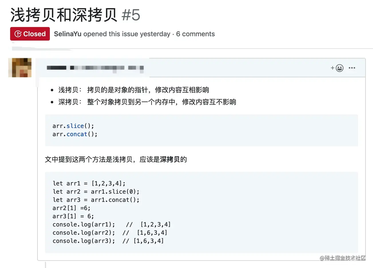 深拷贝已经是一个老生常谈的话题了,也是现在前端面试的高频题目,但是令我吃惊的是有很多同学还没有搞懂深拷贝和浅拷贝的区别和定义。例如前几天给我提issue的同学: