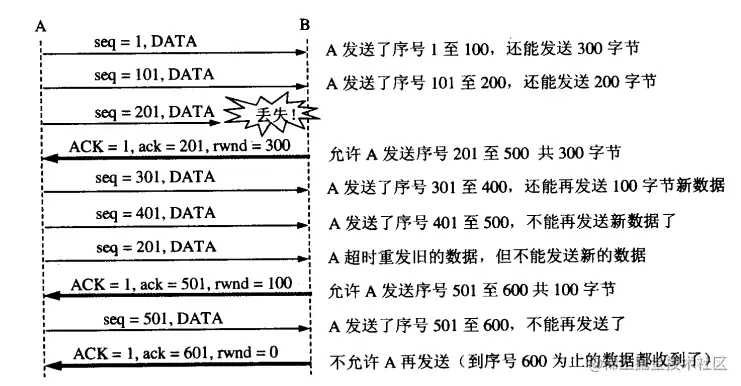 接收方的主机B进行了三次流量控制。第一次把窗口设置为rwind=300,第二次减小到rwind=100最后减到rwind=0,即不允许发送方再发送过数据了。这种使发送方暂停发送的状态将持续到主机B重新发出一个新的窗口值为止。