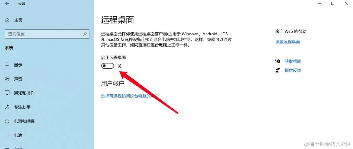 2.4 这时在右侧窗口中找到“远程桌面”设置,找到“启 用远程桌面”一项,把其开关设置为“开”即可打开远程桌面,如果不使用了后可以把其设置为“关”即关闭了远程桌面了。