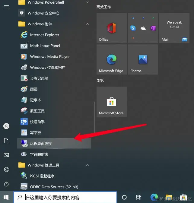 左键点击桌面左下角的开始按钮,打开附件--`远程桌面连接