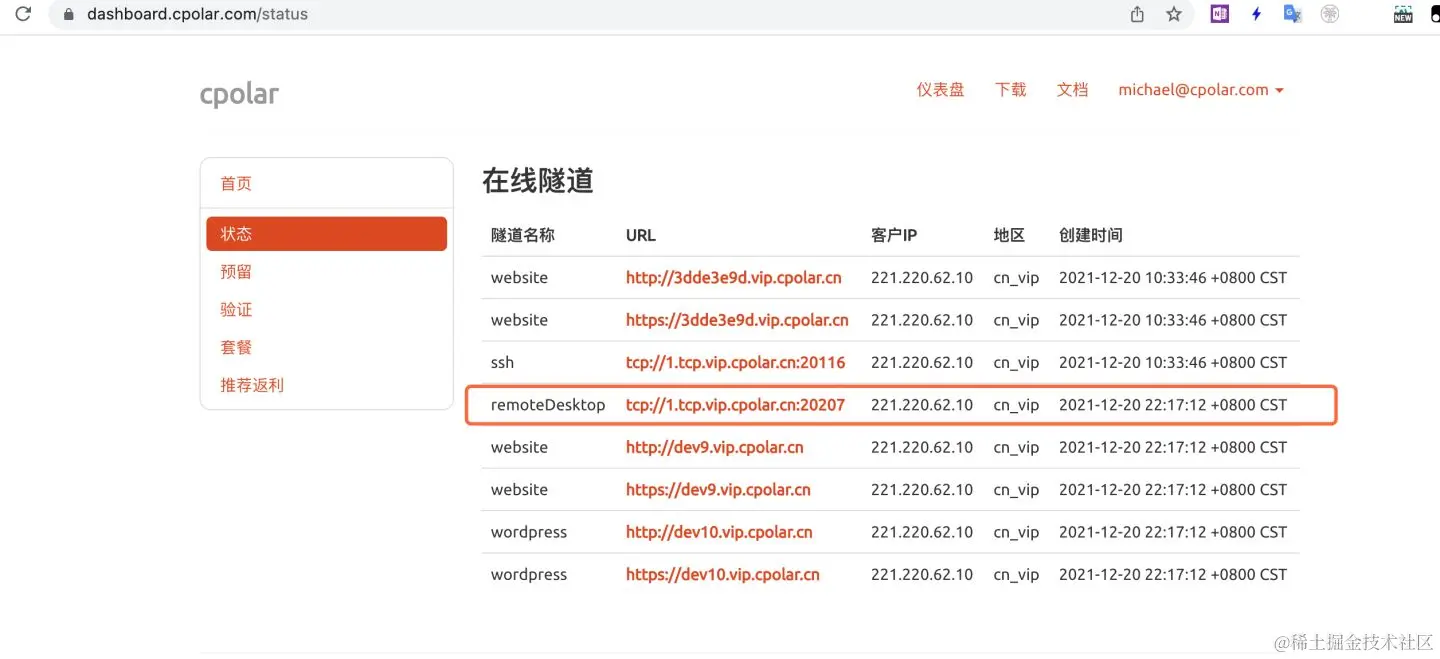 我们看到上图,本例中远程桌面隧道的公网地址为:1.tcp.vip.cpolar.cn:20207 (您获取得到会有所有不同)