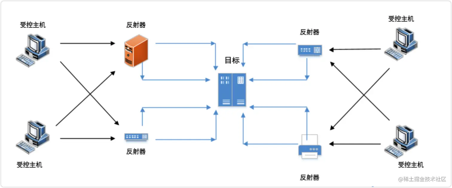 发射攻击又被称为DRDoS(分布式反射拒绝服务)攻击,是指利用路由器、服务器等设施对请求产生应答,从而反射攻击流量并隐藏攻击来源的一种分布式拒绝服务攻击技术。