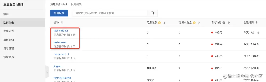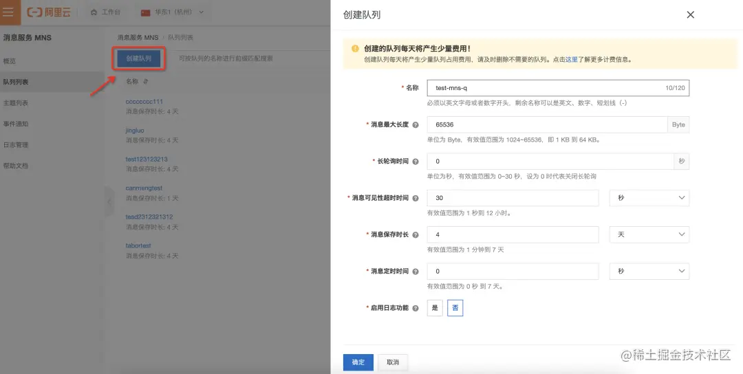 在列表页面,单击创建队列并填写名称信息“test-mns-q”