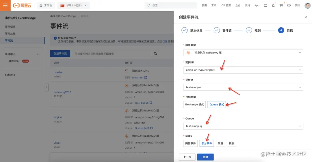 创建事件流名称为“test-amqp-mns2rabbitmq”,点击下一步
