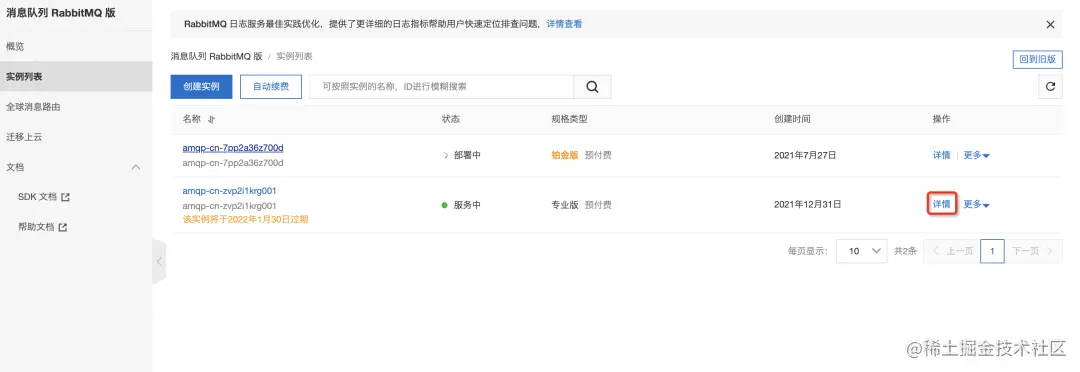 服务类型选择“消息队列 RabbitMQ 版本”,具体配置如下,点击创建