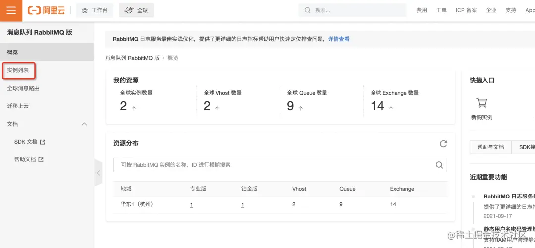 在控制台左边导航栏中,单击实例列表。(资源地域为同地域即可,本次引导默认选杭州)