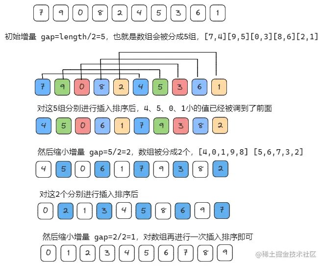 - 然后减少间隔数,并重新将整个序列按新的间隔数分成若干个子序列,再分别对各个子序列进行排序;如此下去,直到间隔数 gap = 1。