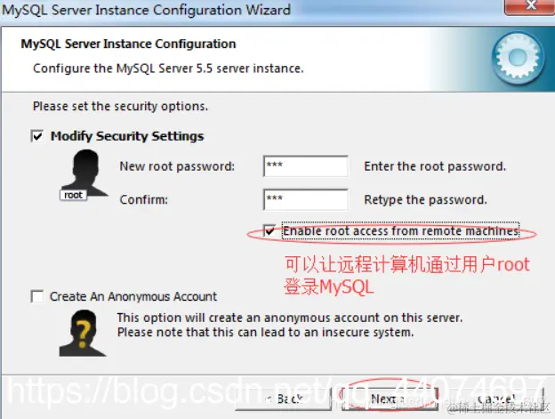 这里是配置MySQL的安全选项,强烈建议为你的MySQL服务器设置一个root密码,默认情况MySQL Configuration Wizard(配置向导)要求你设置一个root密码。如果你不想设置root密码,不选中Modify Security Settings(修改安全设定值)选项旁边的选择框。要想设置root密码,在New root password(输入新密码)和Confirm(确认)两个框内输入期望的密码。如果重新配置已有的服务器,你还需要Current root password(当前root密码)框内输入已有的root密码。要想防止通过网络以root登录,选中Root may only connect from localhost(只允许从本机登陆连接root)选项旁边的框。这样可以提高root账户的安全。要想创建一个匿名用户账户,选中Create An Anonymous Account(创建匿名账户)选项旁边的框。创建匿名账户会降低服务器的安全,并造成登录和许可困难。因此不建议。