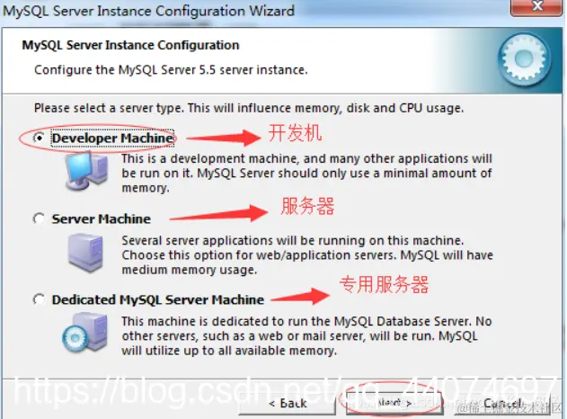 Developer Machine(开发机器):该选项代表典型个人用桌面工作站。假定机器上运行着多个桌面应用程序。将MySQL服务器配置成使用最少的系统资源。