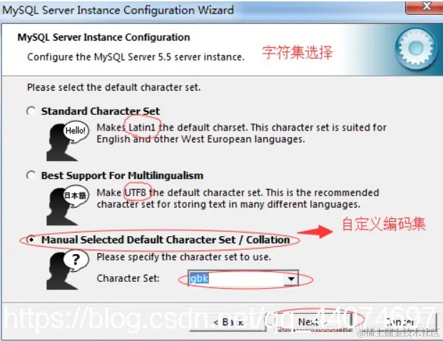(18)选Manual Selected Default Character Set/Collation,复选框选gbk,点击下一步