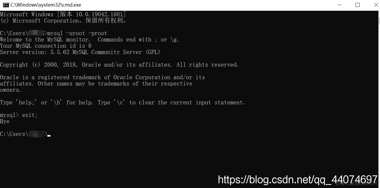 输入:“mysql -uroot -proot” 后出现如下界面,表示安装成功,输入“exit; ”退出。