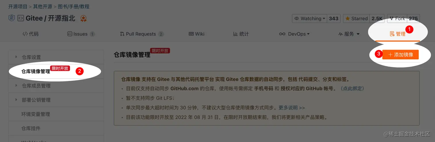- 进入需要使用镜像功能的仓库,进入「管理」找到「仓库镜像管理」选项,点击「添加镜像」按钮,如果你还没有绑定 GitHub 帐号,请根据弹窗提示绑定 GitHub 帐号;