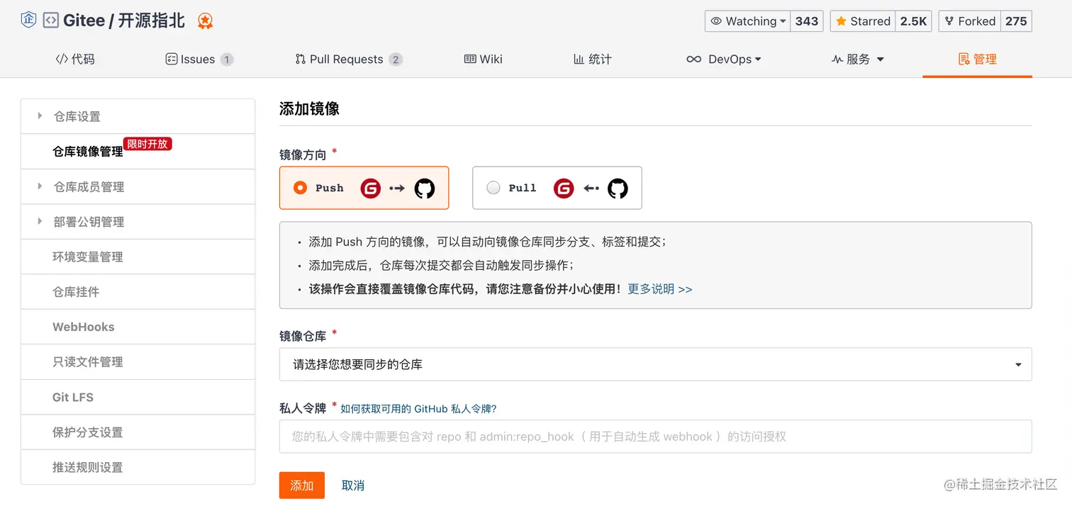 以将 Gitee 的仓库镜像至 GitHub 为例