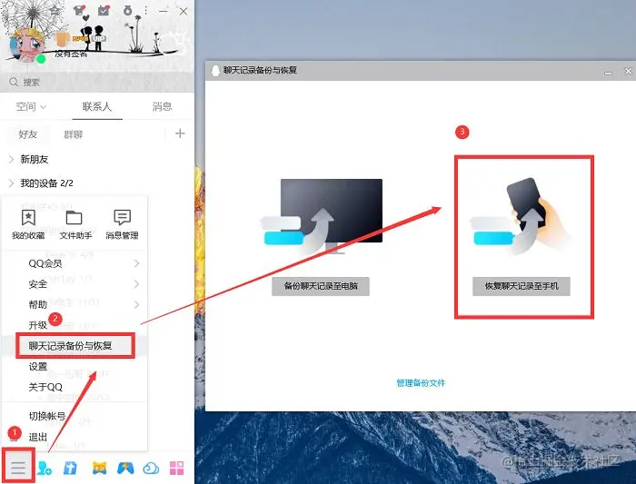 首先打开电脑qq,点击左下角的图标,然后点击“聊天记录备份与恢复”,最后选择“恢复聊天记录至手机”即可。