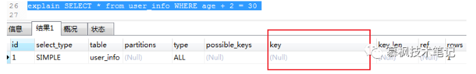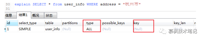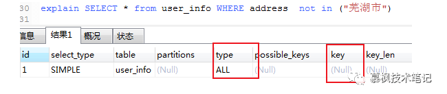 进行 SQL 数据查询的时候,where 条件字段类型与实际表中字段类型不匹配的时候,Mysql 会进行隐式的数据类型转换,而类型转换会使用到内置函数,导致在进行数据查询的时候并没有使用索引。我们可以使用 explain 命令查看 sql 语句。可以看的出来在 key 栏中,对应的值为 null,说明并没有使用索引进行查询。