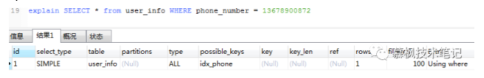 但是如果在按照 phone_number 字段为字符串类型进行查询的时候,Mysql 没有进行隐式的类型转换,所以最终还是走了索引。