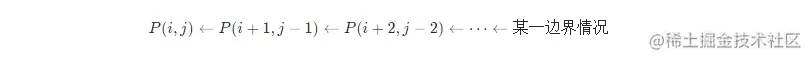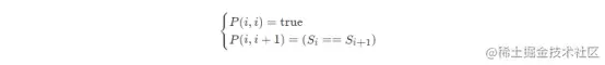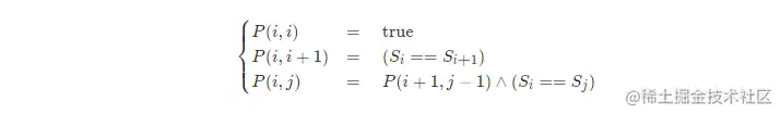 上文的所有讨论是建立在子串长度大于 2的前提之上的,我们还需要考虑动态规划中的边界条件,即子串的长度为 1 或 2。对于长度为 1 的子串,它显然是个回文串;对于长度为 2 的子串,只要它的两个字母相同,它就是一个回文串。因此我们就可以写出动态规划的边界条件: