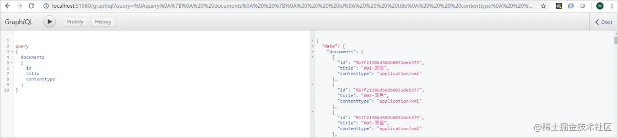 在浏览器中打开 http://localhost:51980/graphiql 网页(注意URL末尾的graph与ql之间有一个字母i),可随时调试API,如下图: