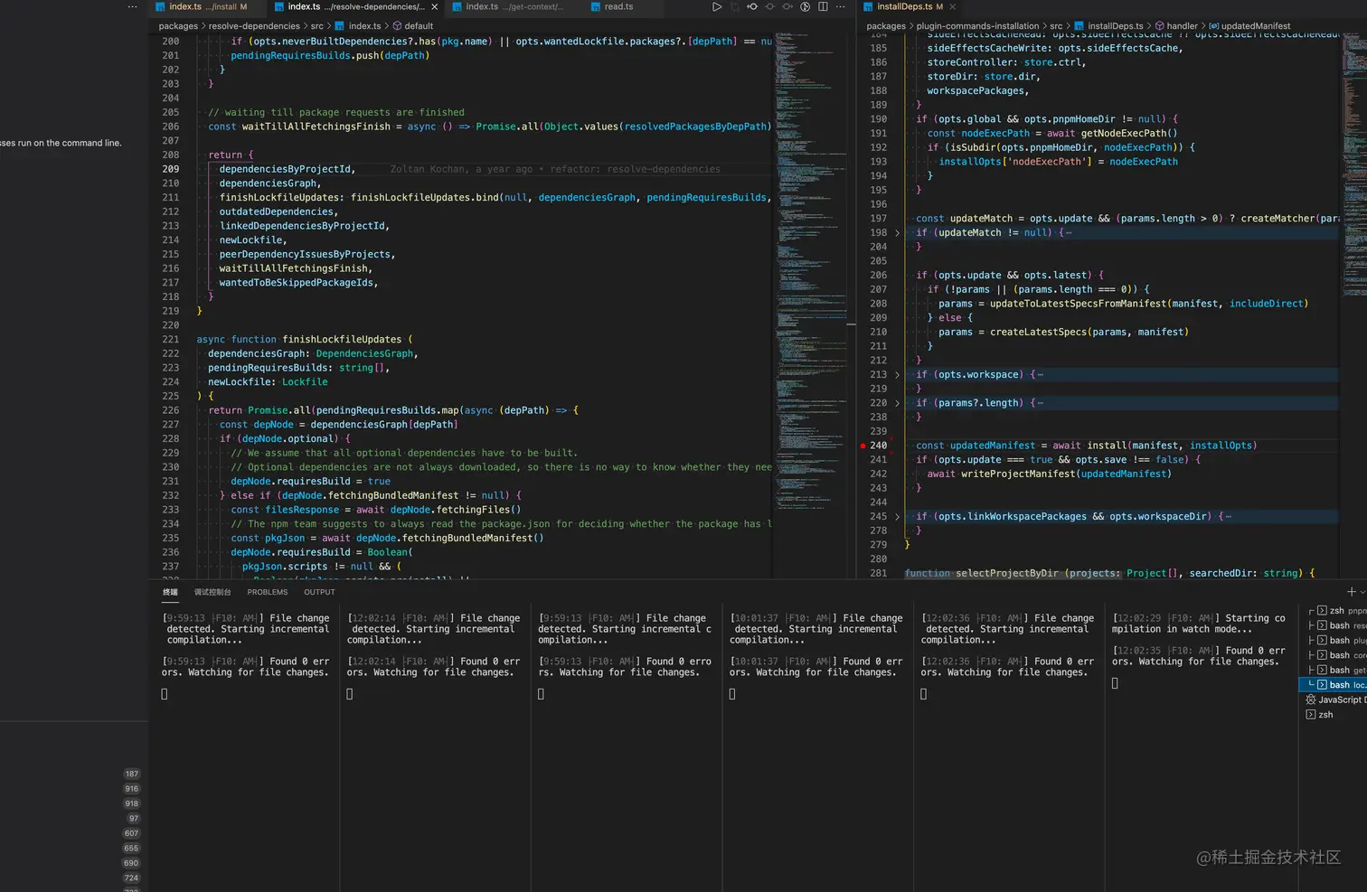 之前笔者在调试 pnpm update 的一个 bug 的时候,就是从 plugin-command-installation 到 resolve-dependencies 一步步抽丝剥茧,最后找到问题出现在一个库函数的语句处理里面,具体可以参考 pr: github.com/pnpm/pnpm/p…