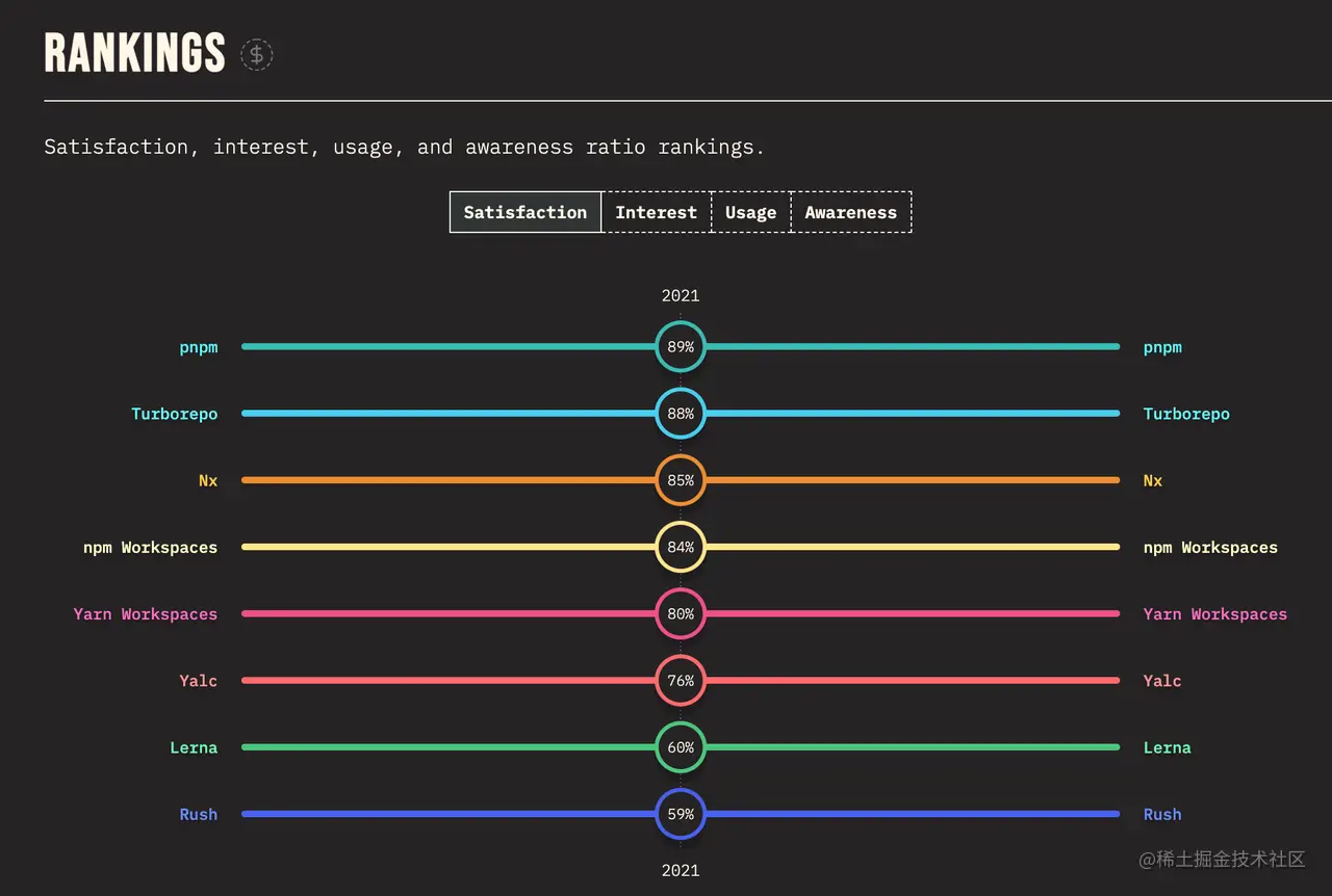 Hi~又是一段时间没有更新了。前几天 stateof js 2021 的调查结果发布了,今年在里面增加了关于 monorepo tools 的调查报告(参考链接: 2021.stateofjs.com/en-US/libra… )。