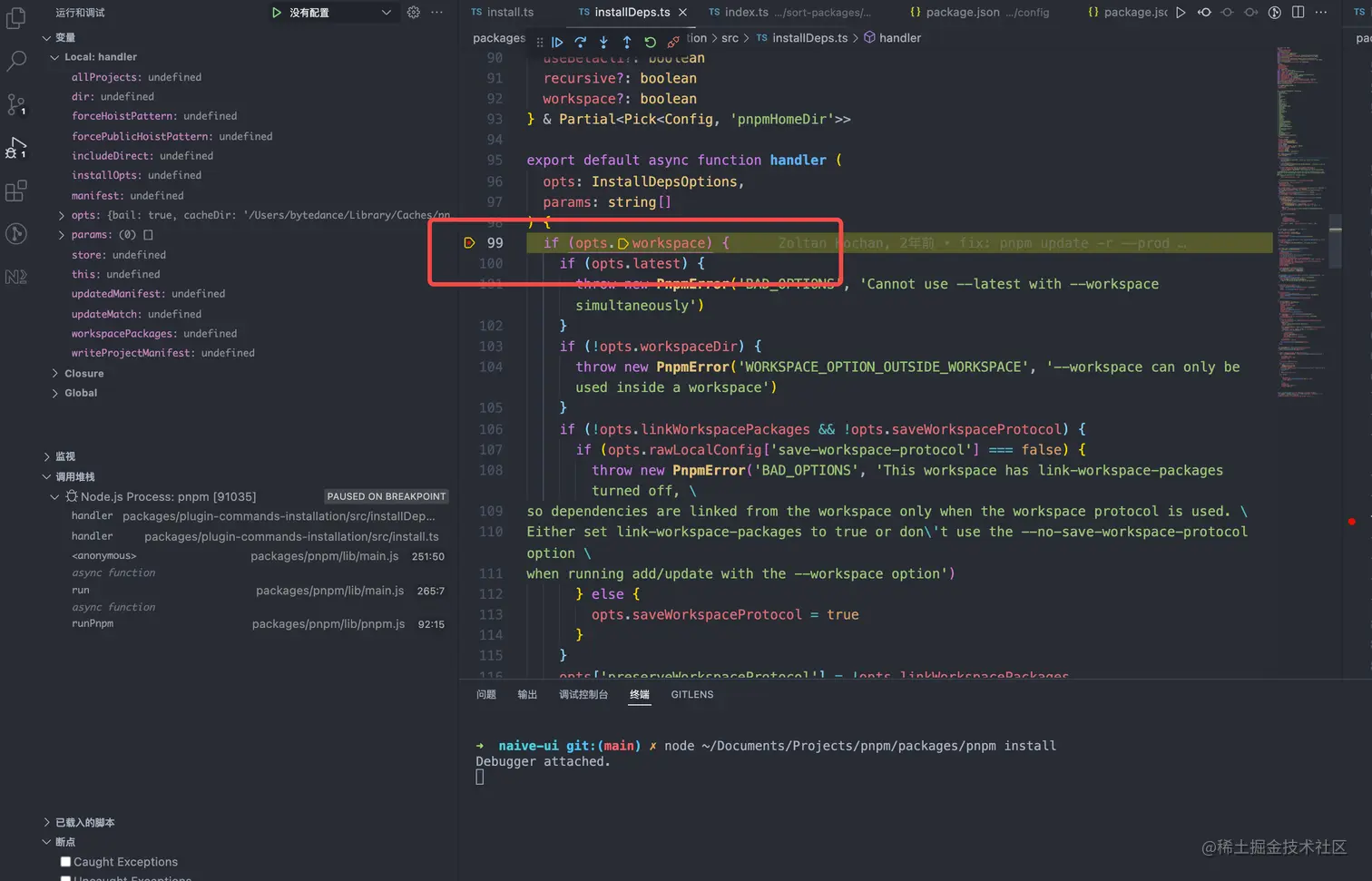 例如这里以 naive-ui (www.naiveui.com/)这个项目(使用 pnpm 作为依赖管理)作为例子,这里可以在 plugin-commands-installation 中需要调试的代码打上断点,然后通过 vscode 的 debug terminal 来进行调试: