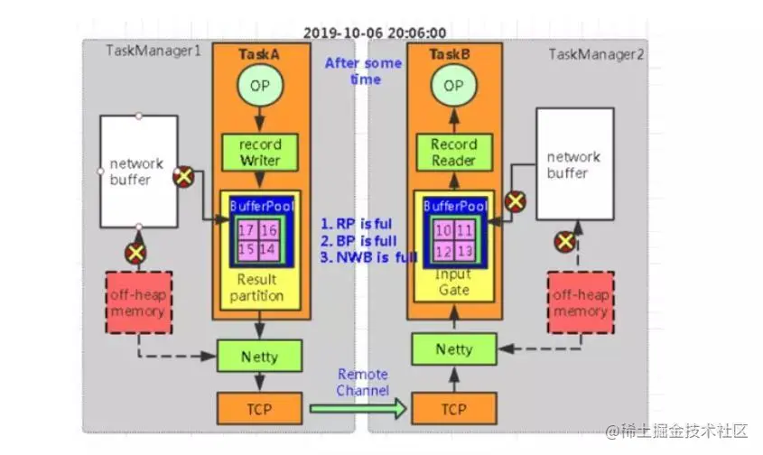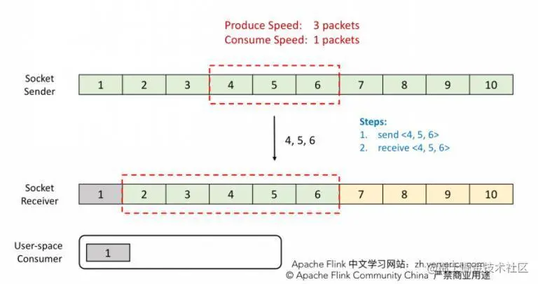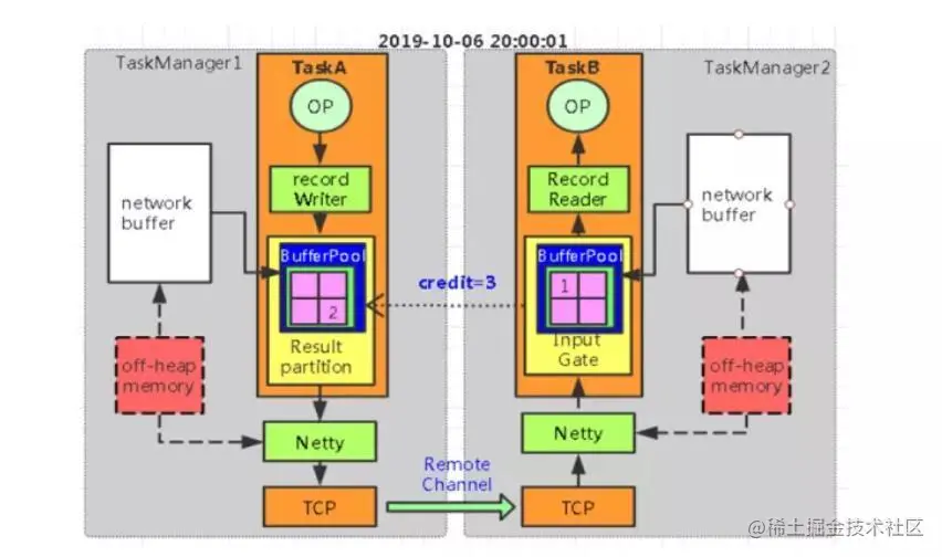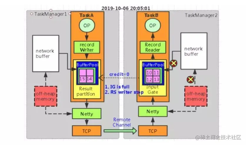 - 如果下游有充足的 Buffer ,就会返还给上游 Credit (表示剩余 buffer 数量),告知发送消息(图上两个虚线是还是采用 Netty 和 Socket 进行通信)。