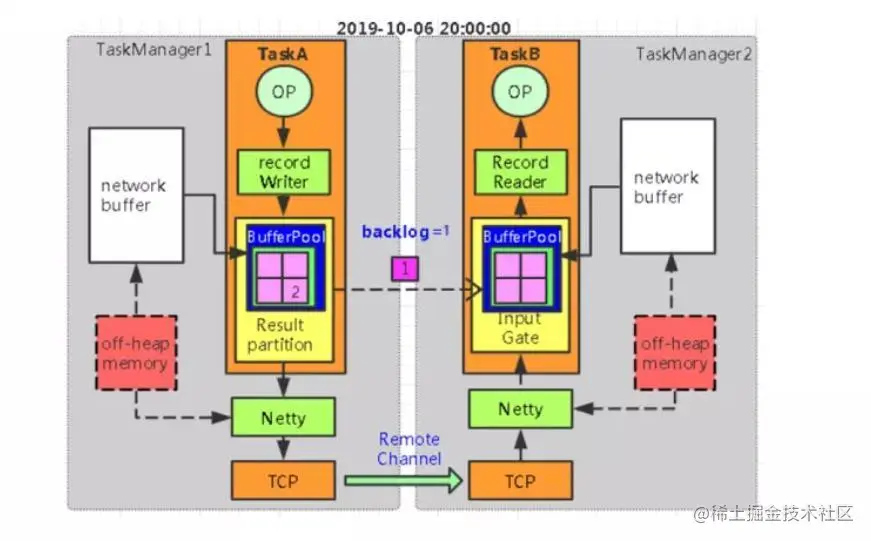 - 每一次 ResultPartition 向 InputGate 发送数据的时候,都会发送一个 backlog size 告诉下游准备发送多少消息,下游就会去计算有多少的 Buffer 去接收消息。(backlog 的作用是为了让消费端感知到我们生产端的情况)