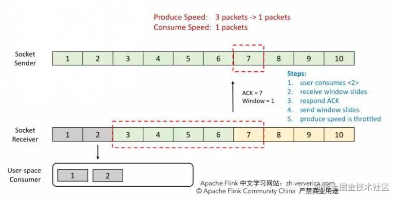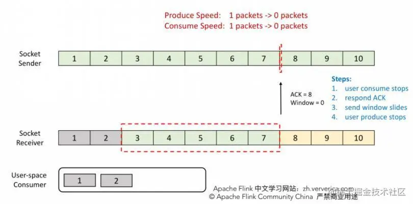 步骤3:发送端将 7 发送后,接收端接收到 7 ,但是接收端的 consumer 故障不能消费数据。这时候接收端向发送端发送 ACK = 8、window = 0 ,由于这个时候 window = 0,发送端是不能发送任何数据,也就会使发送端的发送速度降为 0。