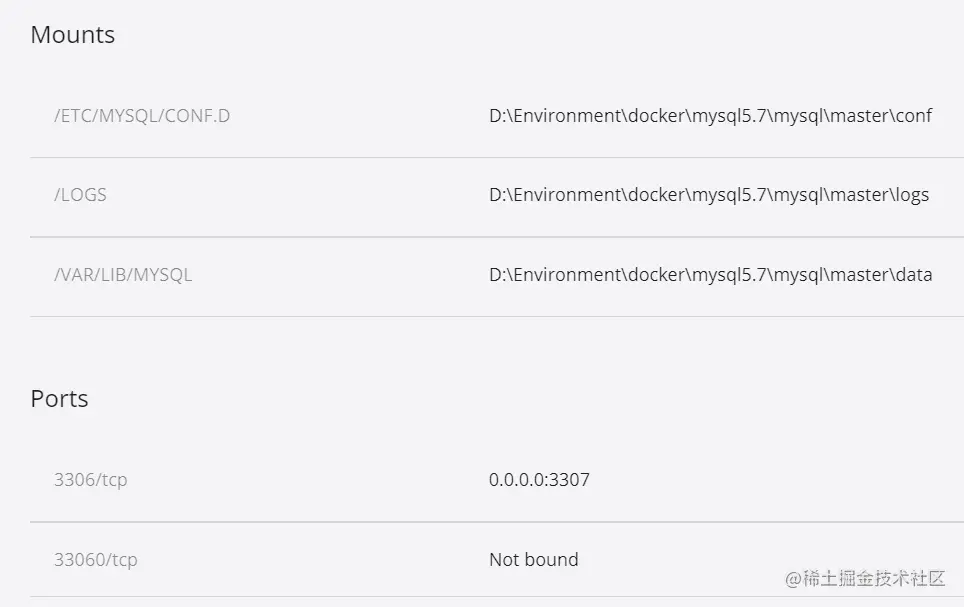 docker run -d -p 3307:3306 -v D:\Environment\docker\mysql5.7\mysql\master\conf:/etc/mysql/conf.d -v D:\Environment\docker\mysql5.7\mysql\master\logs:/logs -v D:\Environment\docker\mysql5.7\mysql\master\data:/var/lib/mysql --name mysql-Master -e MYSQL_ROOT_PASSWORD=root mysql:5.7