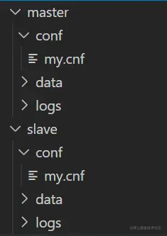 分别创建主从mysql相关文件夹,文件结构如图,包括了my.cnf(配置文件):