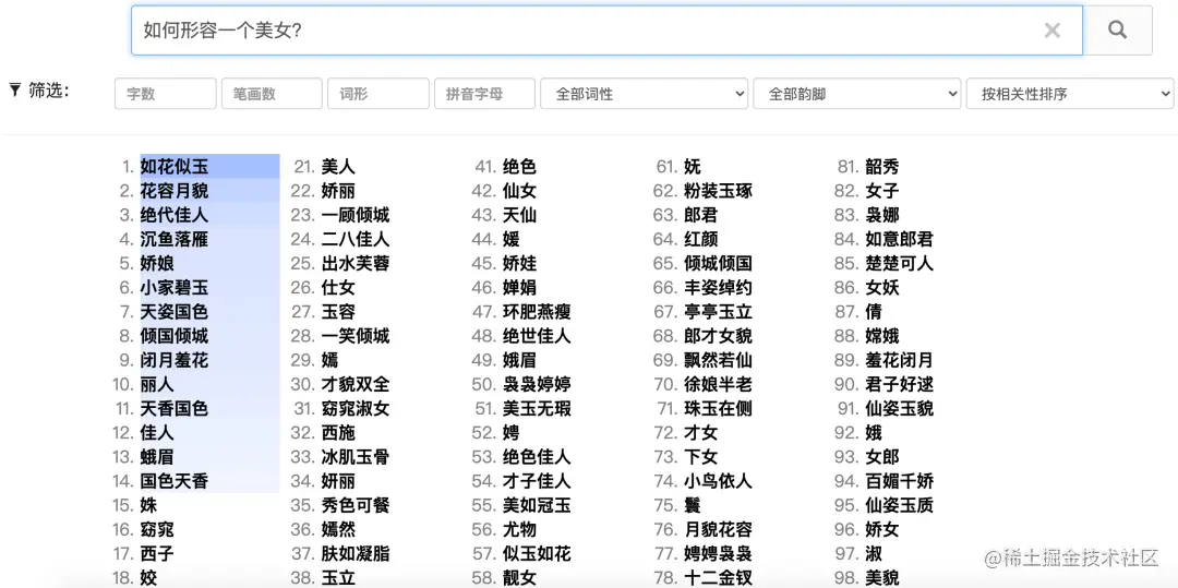 当你输入「如何形容一个美女?」关键词,算法就会生成它认为你应该如何描述。比如:如花似玉、花容月貌、绝代佳人。