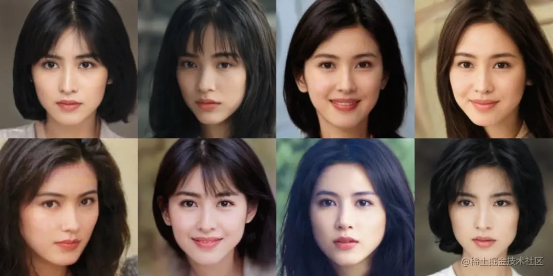 下面这些港风脸都是通过香港美女的数据集训练出来的合成人脸: