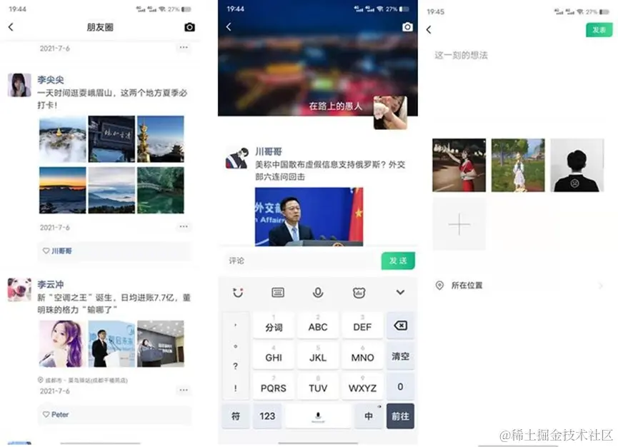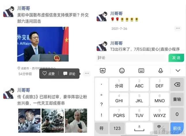 2、点赞评论这个功能主要是样式的设计难度很小但是需要注意当屏幕滚动时需要隐藏评论框以及相关按钮。
