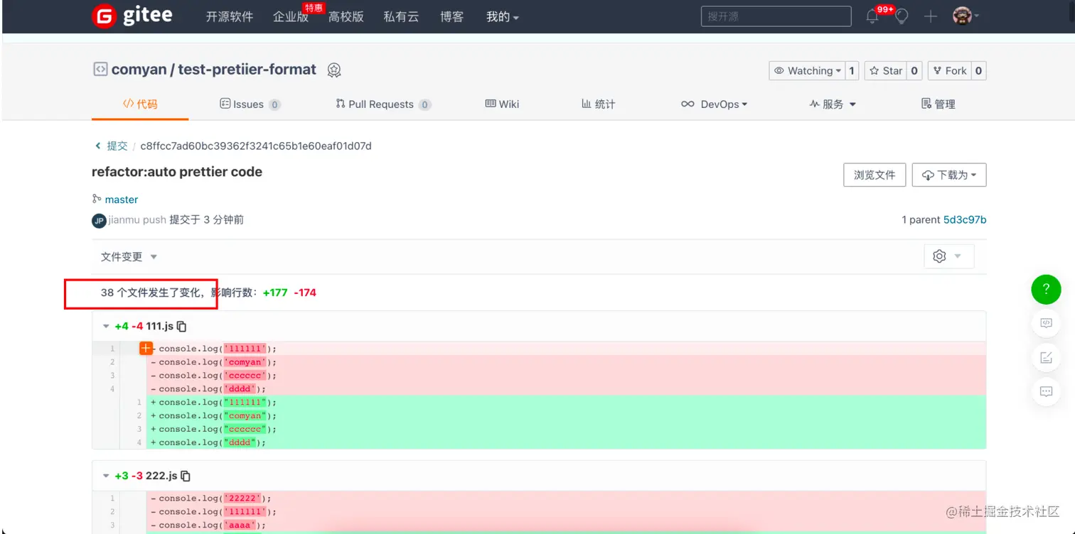 可以看见在这次流程中,prettier节点一共为我们格式化了38个文件,并新增了一条commit信息。
