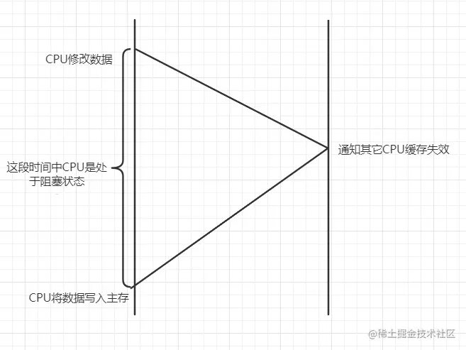 上面提到了如果要保证缓存的一致性,在一个CPU修改数据的时候,会通知其它CPU让缓存行失效,然后才会将数据写入内存中。而在这个通过其它CPU缓存失效的过程CPU会阻塞住。这无疑大大的降低了CPU的资源的利用率。