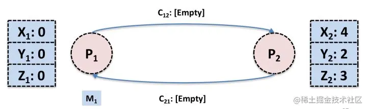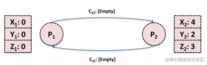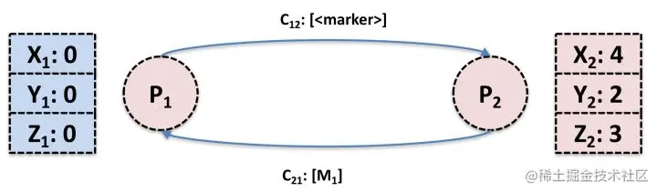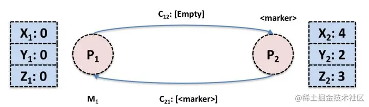 可见,进程对自己的状态是有感知的,而链路本身只负责传递消息,它们的状态不容易记录。并且我们无法让时间静止,各个进程的时钟也很有可能不同步,故不能在一瞬间同时捕获所有进程和链路的状态。所以必须要曲线救国,通过每个进程记录的与自己相关的状态合并出全局状态,这也是Chandy-Lamport算法的核心思想所在。