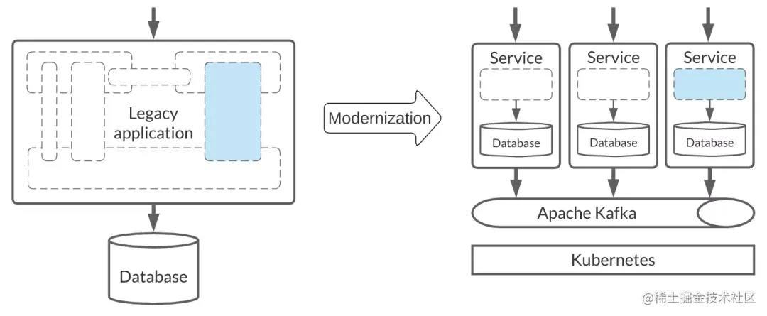 我们已经大致了解了如何使用 Strangler 模式来迁移一个单体的遗留应用,但我们还没有彻底完成对基于微服务的新架构的现代化。接下来,我们考虑一下现代化过程中随后所面临的一些挑战,以及 Debezium、Apache Kafka 和 Kubernetes 如何帮助我们。