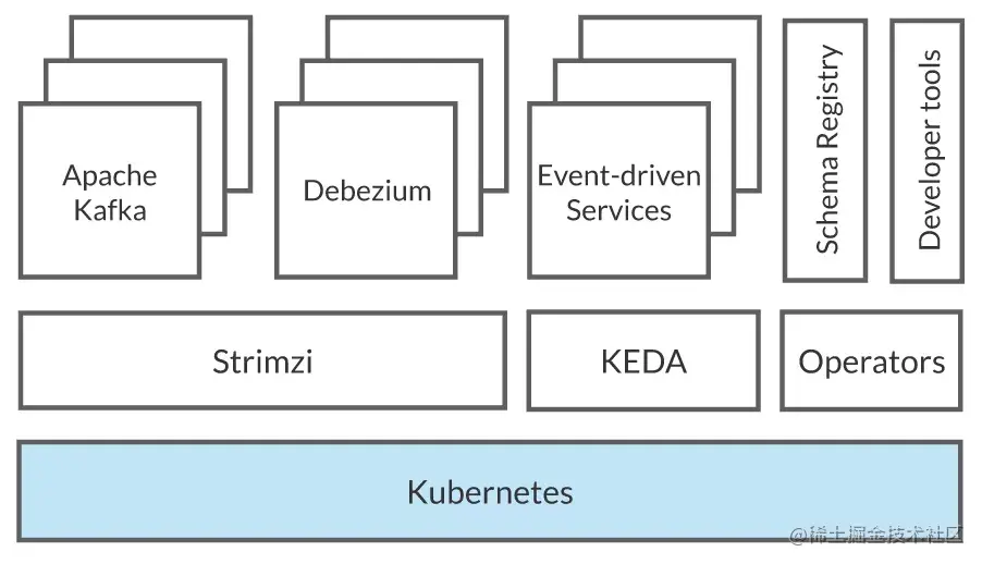 在处理事件驱动的服务时,我们很快会发现需要自动化,并且要与事件驱动的基础设施集成,这就是 Apache Kafka 及其生态系统中其他项目的用武之地了。此外,我们可以使用 Kubernetes Operator 来帮助自动化管理 Kafka 和以下的支撑服务。