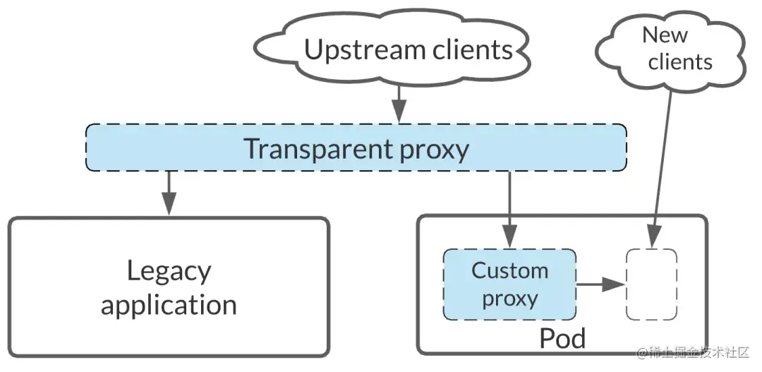 相对于将自定义代理逻辑放到共享层里,不如将其作为新服务的一部分。但是,我们不会在编译期将自定义代理嵌入到服务中,而是使用 Kubernetes sidecar 模式,使代理成为一个运行时的绑定活动。借助这种模式,遗留客户端使用协议转换的代理,而新的客户端则会使用新的服务 API。在代理内部,调用会被进行转换,并被转移到新的服务上。这样的话,在需要时,我们可以重用代理。更重要的是,当遗留客户端不再需要代理时,我们可以很容易地将其拆除,而对新服务的影响做到了最小。