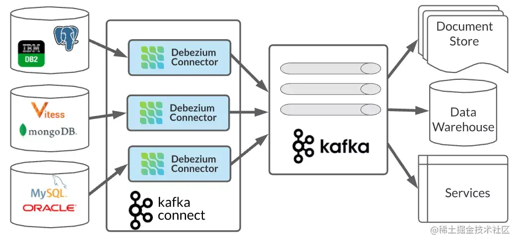 - 快照:Debezium 能够对源数据库当前的状态进行快照,我们可以使用这个功能进行批量数据的导入。快照生成之后,Debezium 将会以流的方式传输变化,以保证目标系统处于同步状态。