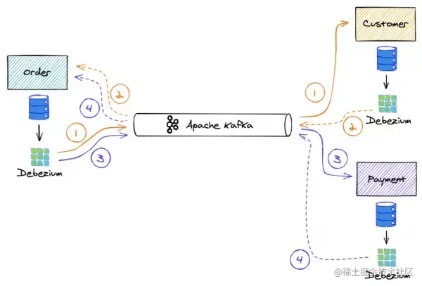 这里最酷的是,我们可以使用 Debezium、Apache Kafka 和 Outbox 模式实现 Saga。有了这些工具,就可以利用编排式的方法,在一个地方管理 Saga 的流程,并检查 Saga 事务的总体状态。我们还可以将编排与异步通信相结合,将协调服务与参与服务的可用性,甚至与 Kafka 的可用性解耦。这给了我们两全其美的结果:编排式以及参与服务之间异步、非阻塞、并行的通信,没有时间上的耦合。