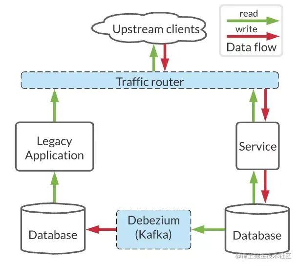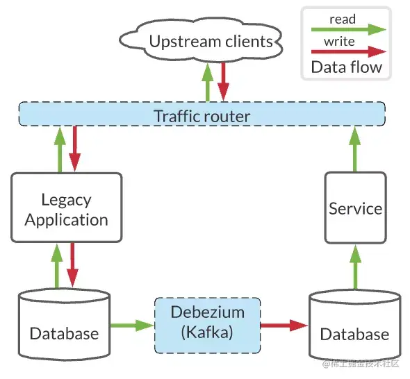结合对 Debezium 的快速描述,我们看一下在 Strangler 模式下的使用情况。假设,到目前为止,我们已经完成了如下的工作: