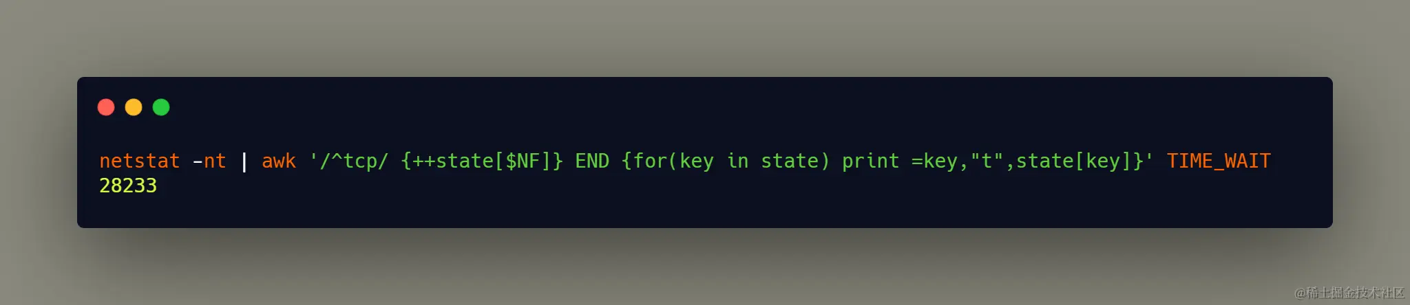 netstat -nt | awk '/^tcp/ {++state[$NF]} END {for(key in state) print =key,"t",state[key]}' TIME_WAIT 28233
