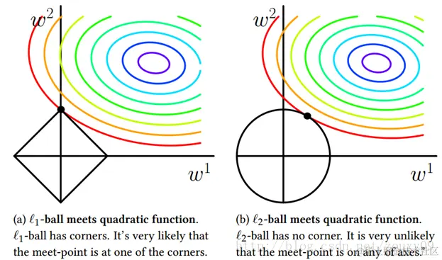 可以看到,L1-ball 与L2-ball 的不同就在于L1在和每个坐标轴相交的地方都有“角”出现,而目标函数的测地线除非位置摆得非常好,大部分时候都会在角的地方相交。注意到在角的位置就会产生稀疏性,例如图中的相交点就有,而更高维的时候(想象一下三维的L1-ball 是什么样的?)除了角点以外,还有很多边的轮廓也是既有很大的概率成为第一次相交的地方,又会产生稀疏性。
