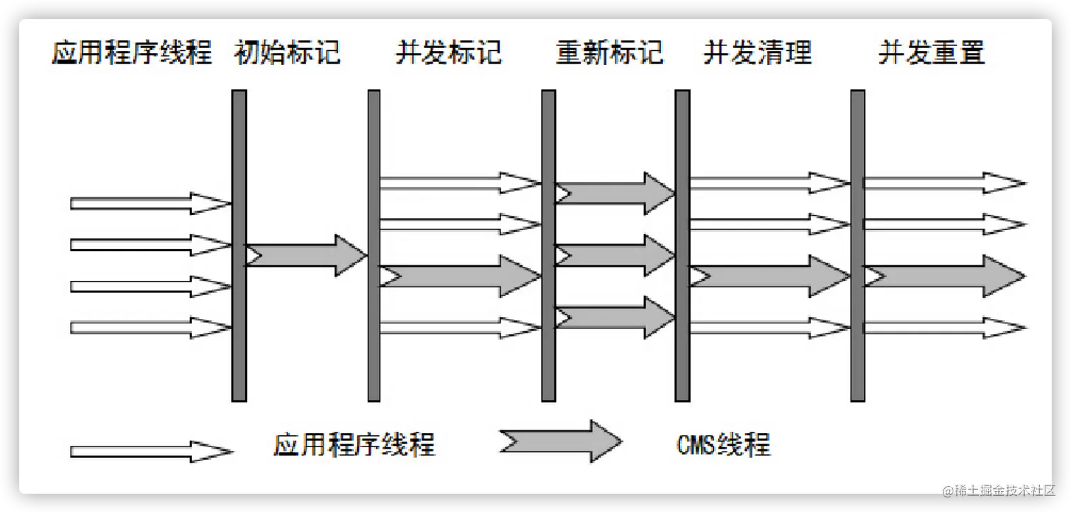 从名字中的 Mark Sweep 这两个词可以看出,CMS收集器是一种 “标记-清除”算法实现的,它的运作过程相比于前面几种垃圾收集器来说更加复杂一些。整个过程分为五个步骤: