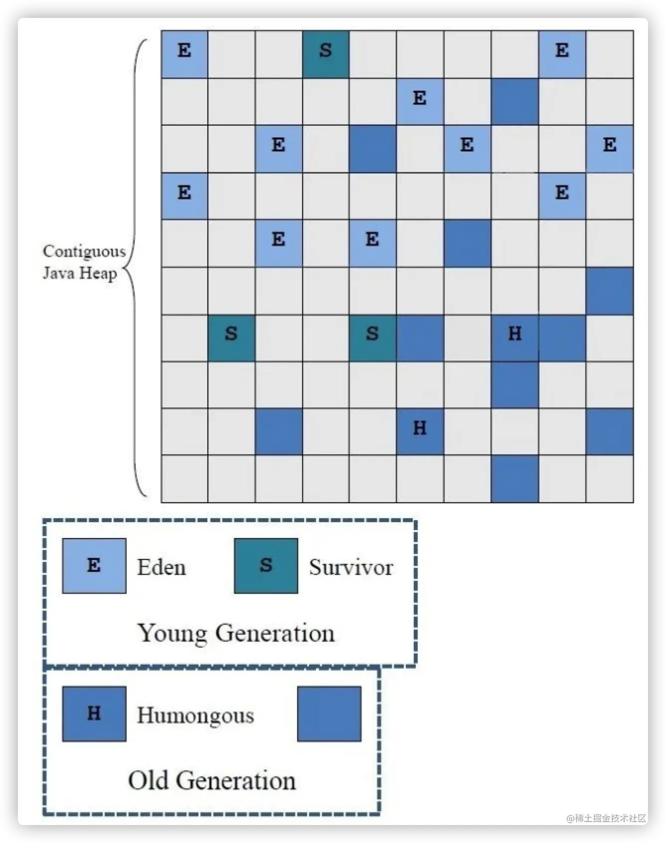 上面的E、S和没有写字母的蓝色方块(可以理解为old),H 是以往的垃圾收集器中没有的概念,它代表 Humongous。
