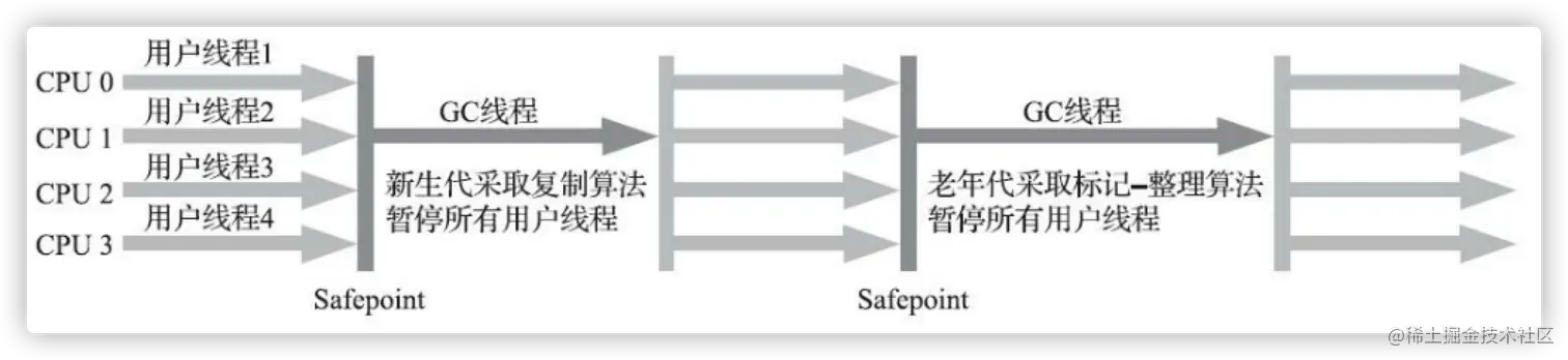 它的 “单线程” 的意义不仅仅意味着它只会使用一条垃圾收集线程去完成垃圾收集工作,更重要的是它在进行垃圾收集工作的时候必须暂停其他所有的工作线程( "Stop The World"),直到它收集结束。