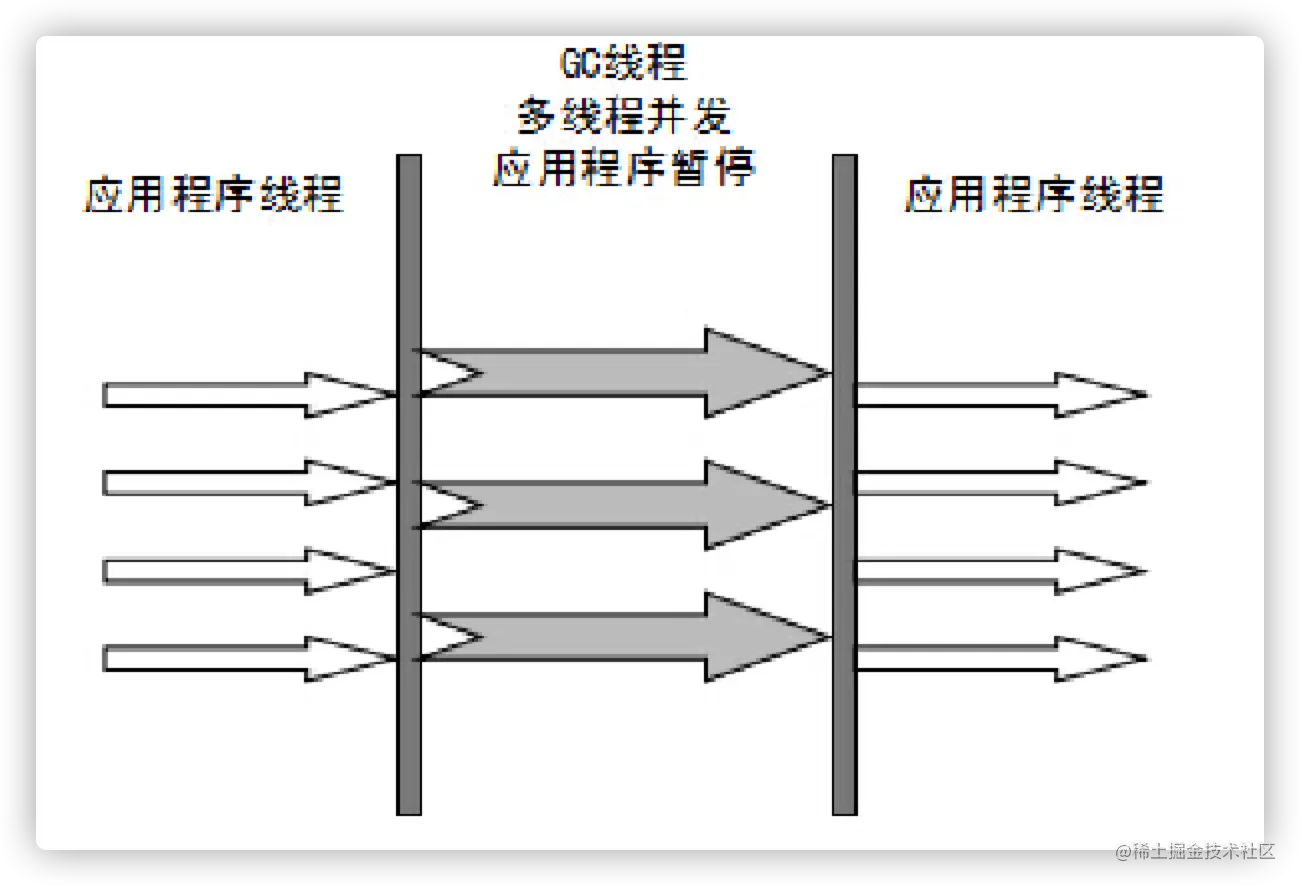该收集器的工作示意图如下图所示,在收集过程中,应用程序也会暂停,但由于并行收集器使用多线程进行垃圾回收,在并发能力比较强的 CPU 上,它产生的停顿时间要短于串行收集器。而在单 CPU 或者并发能力较弱的系统中,并行收集器效果不会比串行收集器好。